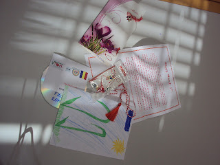 We got a gift from Romania with March talismans, Romanian music and cards drawn and written by our twinners in Bucharest. In Greece we have the same custom, wearing a string of red and white intertwined "so that the March sun won't scorch you'. This March we got snow as well as fair, sunny days. That is why tradition has it that March was a man with two wives, a sulky one and a smiling one. You can guess why! At the end of May we will hang the talisman from a tree, just like in Romania! Thank you very much!